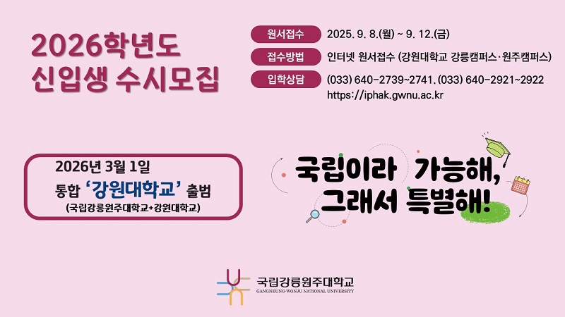 국립강릉원주대학교는 2026년 3월 1일부터 국립강릉원주대학교와 강원대학교가 통합 ‘강원대학교’로 출범함에 따라, 2026학년도 수시모집부터 ‘강원대학교 강릉캠퍼스·원주캠퍼스’로 신입생을 모집한다.