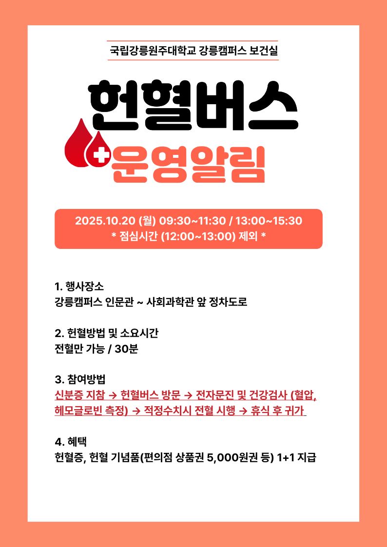 [강릉] (10월) 강릉캠퍼스 헌혈버스 운영(10.20.월)